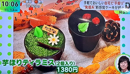 2024年11月13日、日本テレビ「DayDay.」のHOT TODAYのコーナーにて、「手軽でおいしい自宅で芋掘り!発掘系新感覚ケーキが続々」の商品として、おいもやの「芋ほりティラミス」をご紹介いただきました。